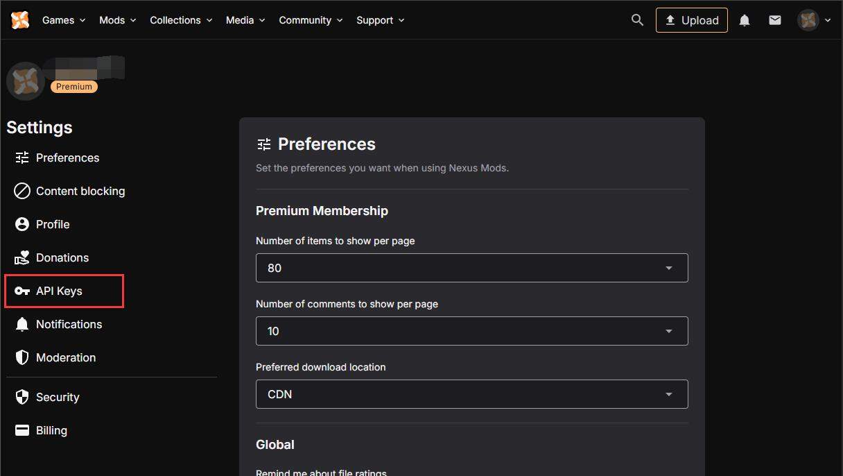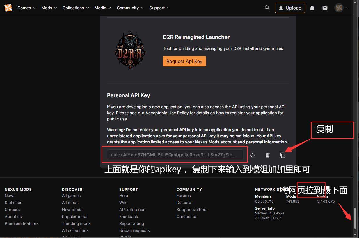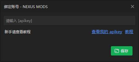 1.打开 4.查看页面 apikey(https://next.nexusmods.com/settings/api-keys ),将页面拉到最下面就可以看到你的[apikey],需要登录后才能看到。