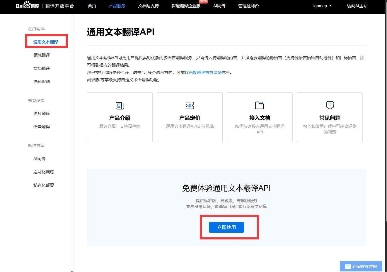 通用文本翻译申请页面:https://fanyi-api.baidu.com/product/11