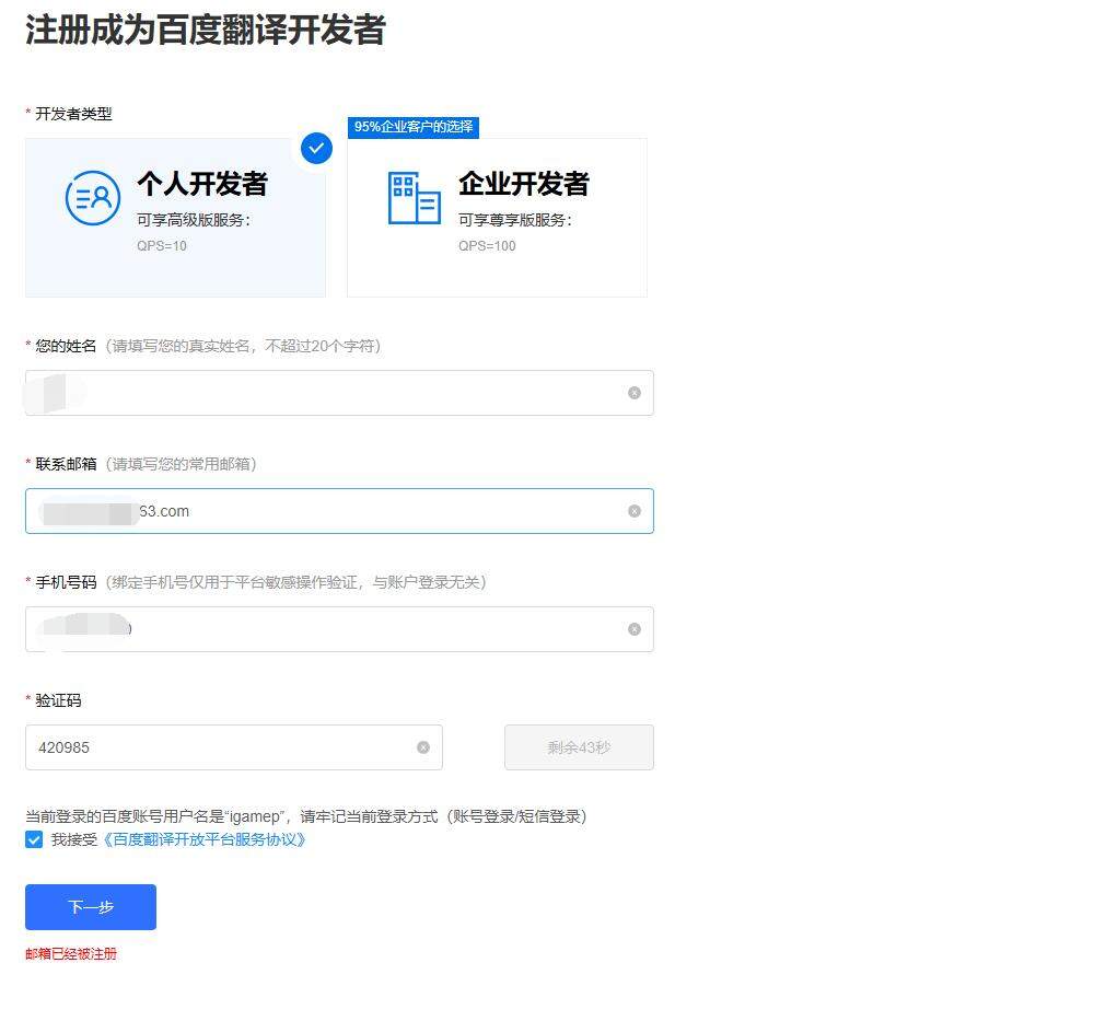 流程→注册账号→个人实名认证→添加应用→开通【通用文本翻译】
